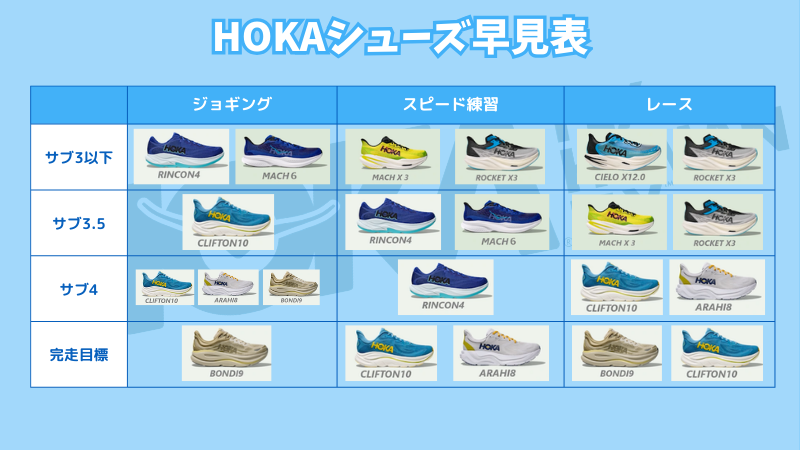 HOKAはモデル数が多いため、どれを選べばいいか分かりにくいです。自分に合うHOKAのシューズを見つけられる早見表を作成したので参考にしてみてください。